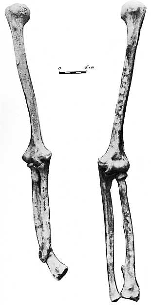 • le premier concerne un individu masculin de la nécropole de Néris - les - Bains, Allier [17 - 20] : la consolidation s’est effectuée en position vicieuse avec un énorme cal, qui a rejeté en arrière, le fragment inférieur avec raccourcissement de 5,5 cm et une forte angulation antéro - postérieure (cf.fig.2)..